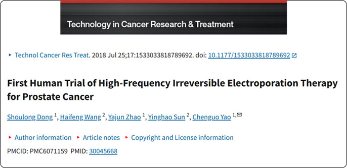 1. 2018年发表在Technology in Cancer Research & Treatment,影响因子2.8,标题为“First Human Trial of High-Frequency Irreversible Electroporation Therapy for Prostate Cancer”(高频不可逆电穿孔治疗前列腺癌的首次人体试验)