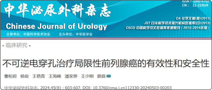 3. 2024年发表在《中华泌尿外科杂志》,标题为“不可逆电穿孔治疗局限性前列腺癌的有效性和安全性”