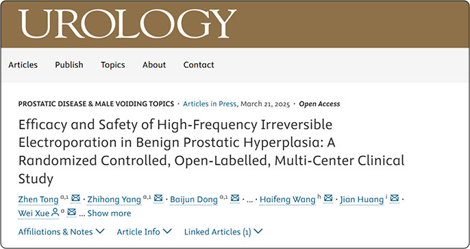 1. 2025年发表在Urology,标题为“Efficacy and safety of high-frequency irreversible electroporation in benign prostatic hyperplasia: a randomized controlled, open-labelled, multicenter clinical study”(高频不可逆电穿孔治疗良性前列腺增生的有效性和安全性:一项随机对照、开放标签、多中心临床研究)