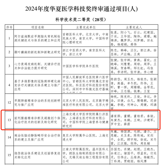 中国医疗保健国际交流促进会于9月底正式公布了2024年度华夏医学科技奖的终审通过项目名单。诺生医疗与上海交通大学医学院附属仁济医院及中国科学院上海营养与健康研究所凭借【前列腺癌精准诊断及超微创个体化治疗技术的创新及转化研究】荣获科技技术奖二等奖。这一奖项是对我们在前沿技术创新和临床转化领域不懈努力的高度认可。