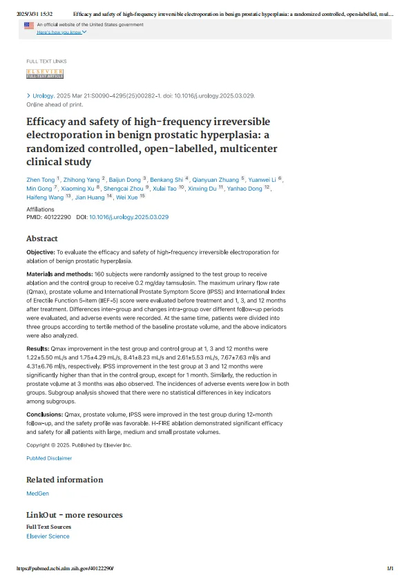 此次发表的论文题为《Efficacy and safety of high-frequency irreversible electroporation in benign prostatic hyperplasia: a randomized controlled, open-labelled, multicenter clinical study》,是H-FIRE技术在前列腺增生治疗领域的又一里程碑。该研究由来自仁济医院、同济医院、上海市东方医院、山东大学齐鲁医院等国内顶尖的泌尿外科专家团队主导,通过严谨的随机对照试验,为H-FIRE技术的临床应用提供了权威验证及肯定。